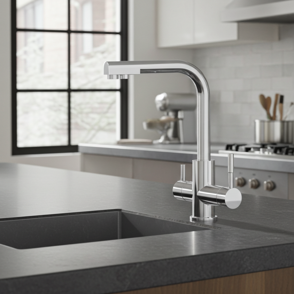 U kunt de 3-weg kraan monteren tot een werkbladdikte van maximaal 75 mm. De montage kunt u ook als onervaren klusser zelf uitvoeren of gebruikmaken van de diensten van een deskundige installateur. De gehele techniek van de kraan blijft verborgen onder de gootsteen.