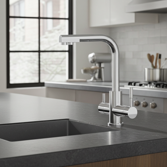 Om een glas met het beste filterwater te vullen bij de 3-weg kraan, bedient u eenvoudig een hendel die tegenover de koud- en warmwaterregelaar is geplaatst. Uit de aparte leiding stroomt dan helder verfrissend water. Voor afwassen, handen wassen en koken kunt u de kraan net zo bedienen als bij een normaal model. Zo eenvoudig kan waterfilteren zijn.